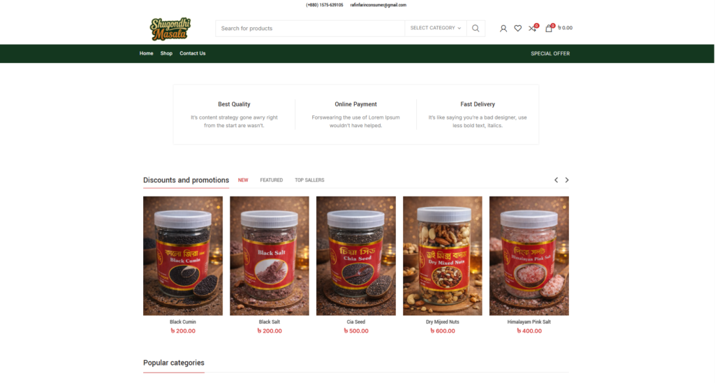 ➤ WooCommerce shop, cart and checkout configured for single‑item and mixed‑cart orders, supporting coupon codes and shipping options.
